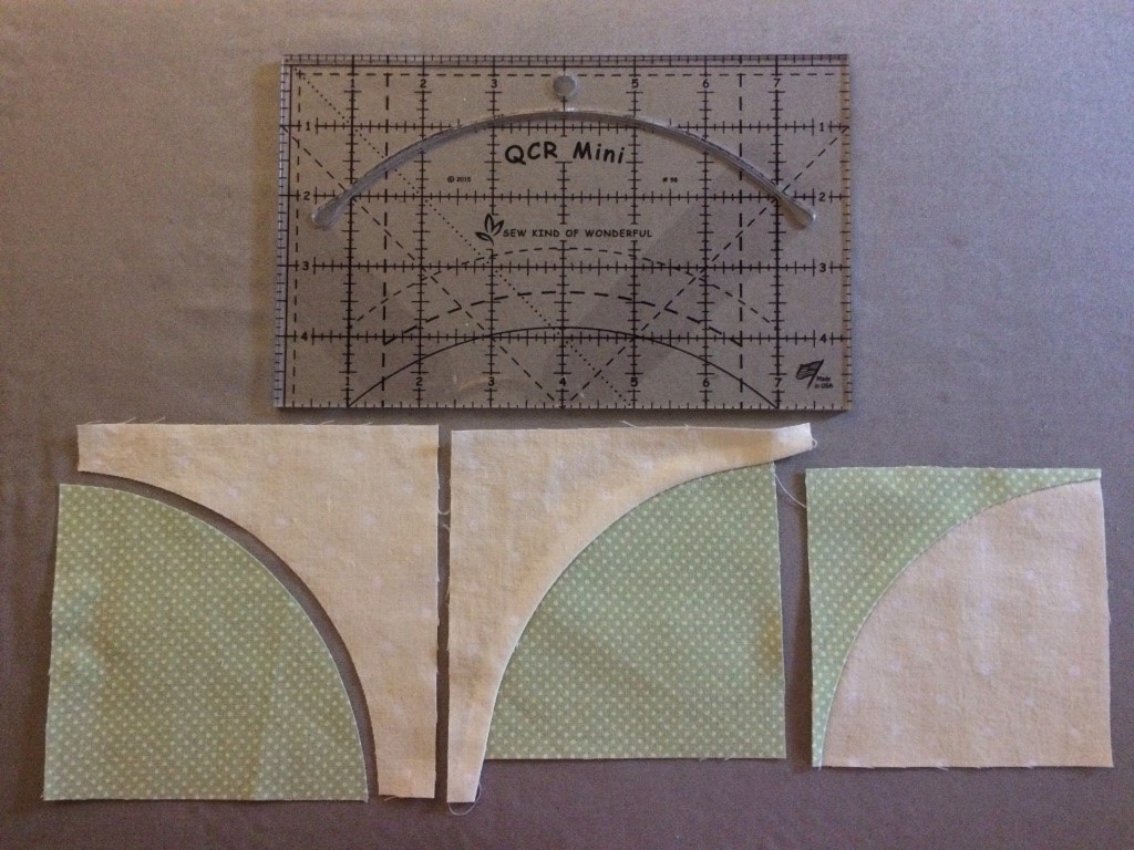 You can see the cut pieces. It looks like they will never fit, but they do. The sewn block is not trimmed. They fit together perfectly. The foot has a built in 1/4” seam guide. It is at the right bottom of the picture. You hold the top curved piece lightly with your thumb and index finger slightly up from the bottom fabric. As long as you don’t stretch either fabric, they will join evenly. At the end, do need to hold the upper fabric with bent-tip tweezers so it will go into place perfectly. There is no pinning or marking. They have adapters included for most any machine, even slant needle machines. Do yourself a favor and check out their website.