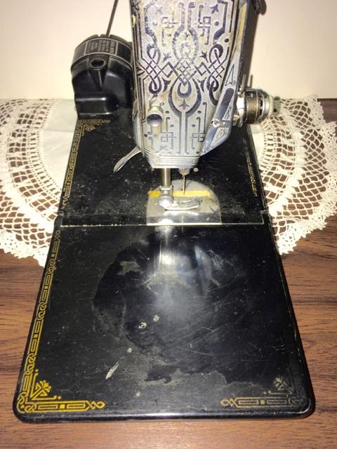 This Singer 221 Featherweight has a manufacture date of March 15,1937. It is the oldest of my Featherweight machines. Notice it has a chrome stitch length indicator which is rarely seen. This machine was well loved as it shows more decal loss. Also the clear coat has been damaged, probably by a cleaning product. I’m in the process of cleaning this machine so the tension assembly is removed. Following the information of experts out there in the world, I will attempt to replace the missing decals and replace/repair the clear coat.