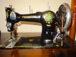 My Federation treadle machine was manufactured in Britain by the Jones Company. They made sewing machines for the Co-operative Wholesale Society and badged them with different names for various retailers. On the bed of the machine is a pretty logo “CWS” for Co-operative Wholesale Society. The society must be something similar to our Costco, but owned by 8 million members.