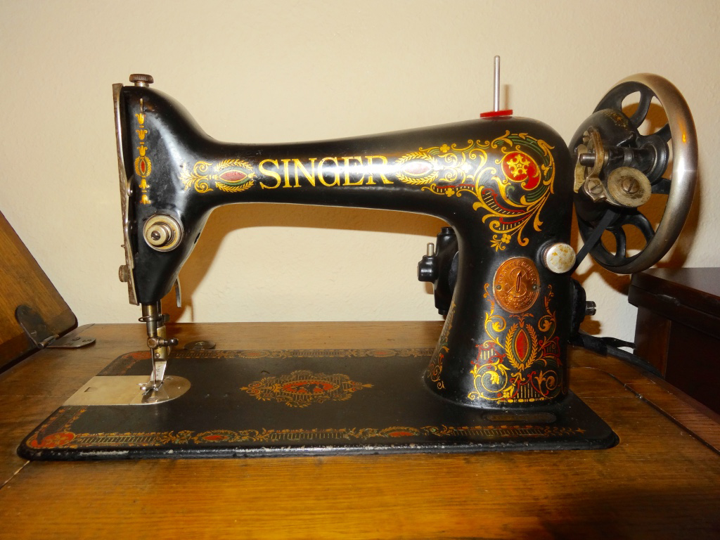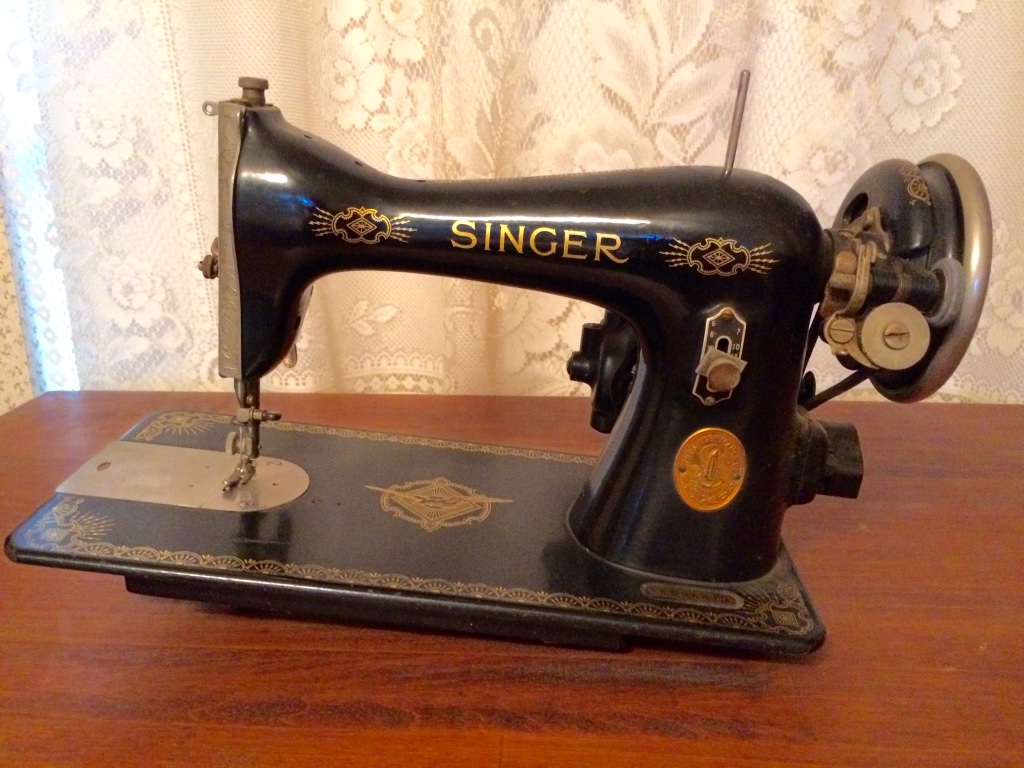 My Singer Red-Eye model 66 machine was made on April 29, 1919. I found this pretty machine at an estate sale for a mere $19.00. It came in an after-market plastic case. The decals aren’t perfect, but pretty good. It has a drop in bobbin and is a back clamp machine. Meaning the screw that tightens the foot to the machine is in the back rather than the side. Singer only made the back-clamping machines for a few years in the early 1900’s. I actually found a Singer back-clamping two-thread embroidery attachment for the machine. Regretfully I sold it.