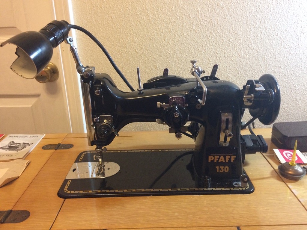 My Pfaff model 30 treadle machine was made in 1955 in Kaiserslautern, Germany.  It was an estate sale find and came in a very pretty parlor cabinet.  It came with only a couple of feet.  Since it is purely a straight-stitch machine, that is fine with me.  However, I probably have feet that will fit it and just don’t know it. A friend has brought me and relatives have sent me attachments from Germany.  This machine makes a beautiful stitch.  It has a wooden treadle and makes a little thump when treadling.  I will have to figure out if that thump can be eliminated.  Never-the-less, I love this machine.