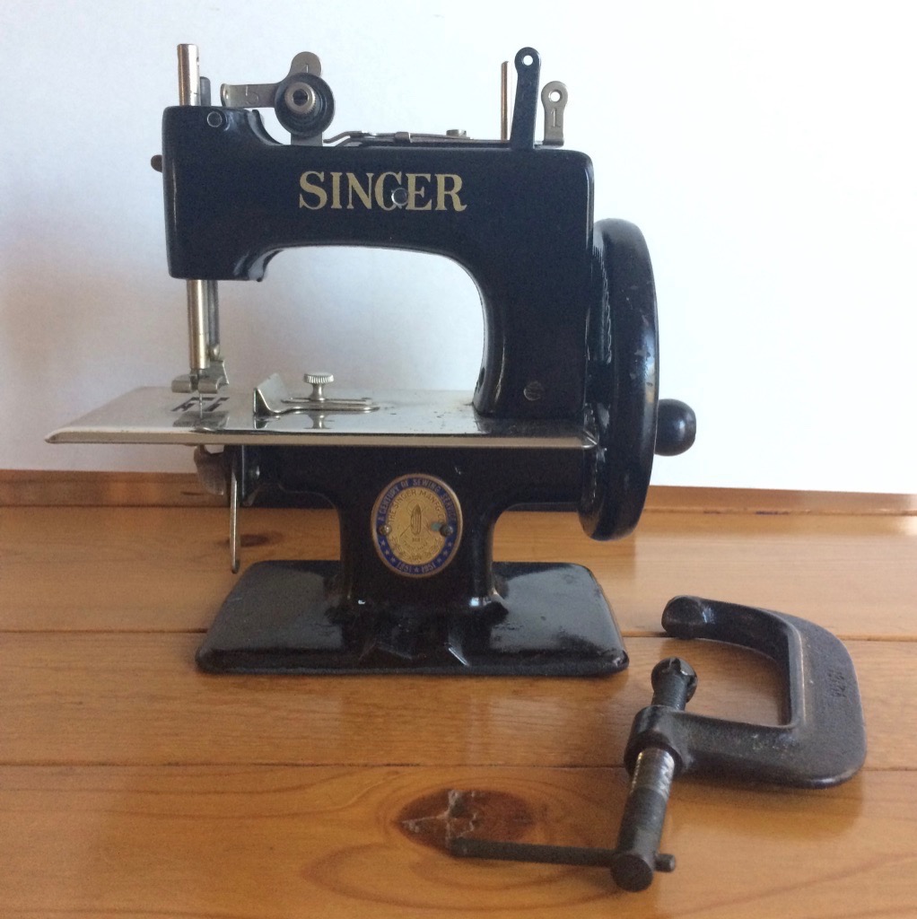 Singer toy machines first appeared in the 1920’s as a Singer model 20.  In the 1950’s they changed the design and they were then named the Sew Handy.  They came in different colors.  My sister and I got one for Christmas in the 50’s that is beige crinkle paint.  I found this black one at an estate sale minus the clamp that holds it onto a table.  Fortunately, a few years later I came across an orphan clamp that was made for this machine.  A lot of little girls learned to sew on these.  It makes a nice chain stitch which came in handy for little ones learning to sew.  I know I appreciate a chain stitch when I am taking something apart.  To make it easier to thread this machine, the places the thread passes through are numbered.  it is a quality machine and makes a quality stitch even though it is a toy.  Now us older girls collect them.