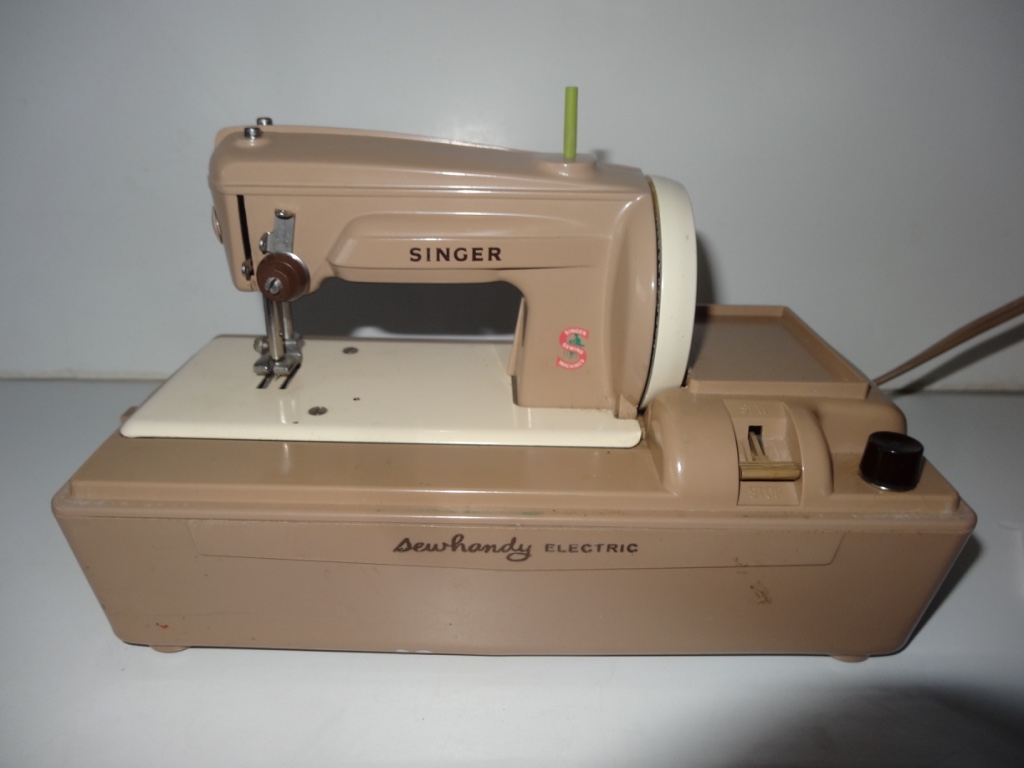 I found my British electric Sewhandy model 50D on a road trip passing through Schulenburg, TX at an antique store.  Everything Singer jumps out at me.  It is in great condition and works.  You turn the knob on the right of the machine to turn the motor off and on.  There is a lever that you push upwards to sew and downwards to stop.  It makes a chain stitch just like my other Sewhandy.  I hope the little girl who owned it enjoyed many hours of playful sewing.